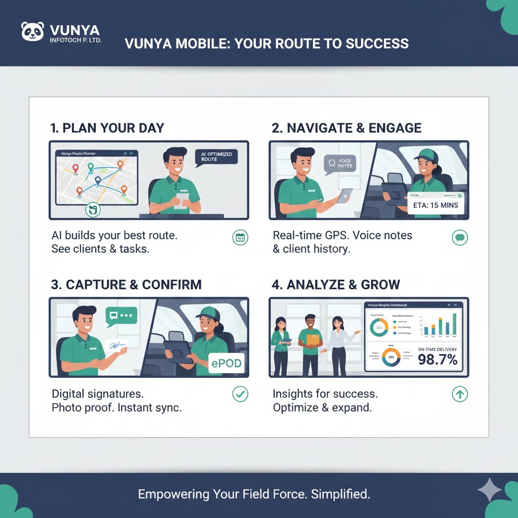 For the logistics wing, the Vunya Mobile App serves as a digital co-pilot. Transition from chaotic delivery schedules to a synchronized, high-visibility operation.